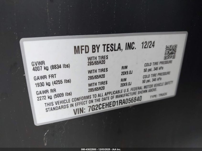 2024 TESLA CYBERTRUCK 2024 року Електричний, U, Повний привід, vin - 7G2CEHED1RA056840 з США