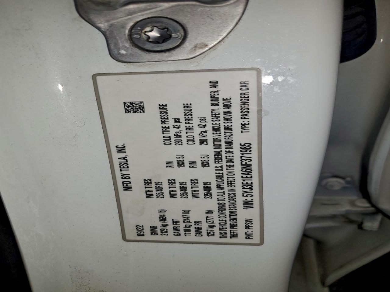 2022 TESLA MODEL 3 2022 року Електричний, , Задній привід, vin - 5YJ3E1EA6NF371985 з США