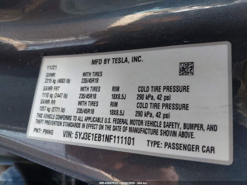 2022 TESLA MODEL 3 2022 року Електричний, U, Повний привід, vin - 5YJ3E1EB1NF111101 з США