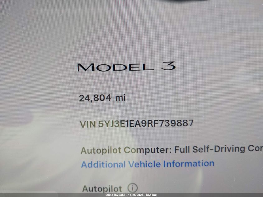2024 TESLA MODEL 3 2024 року Електричний, U, Задній привід, vin - 5YJ3E1EA9RF739887 з США