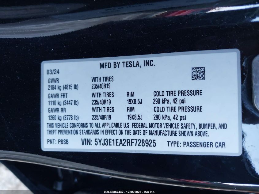 2024 TESLA MODEL 3 2024 року Електричний, U, Задній привід, vin - 5YJ3E1EA2RF728925 з США