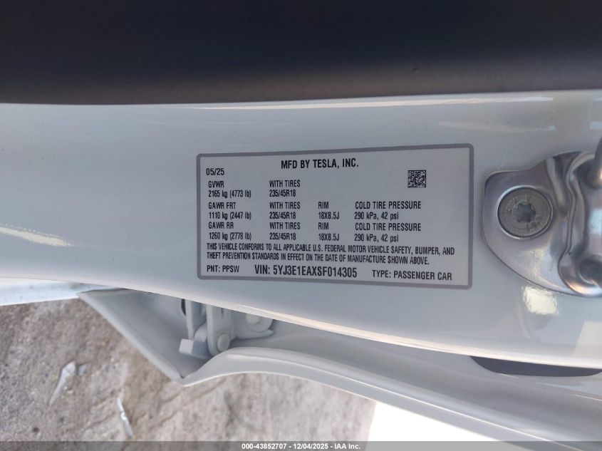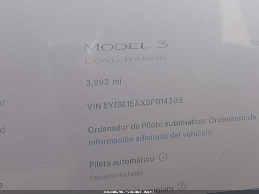 2025 TESLA MODEL 3 2025 року Електричний, U, Задній привід, vin - 5YJ3E1EAXSF014305 з США
