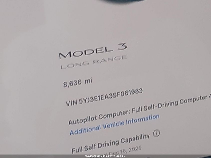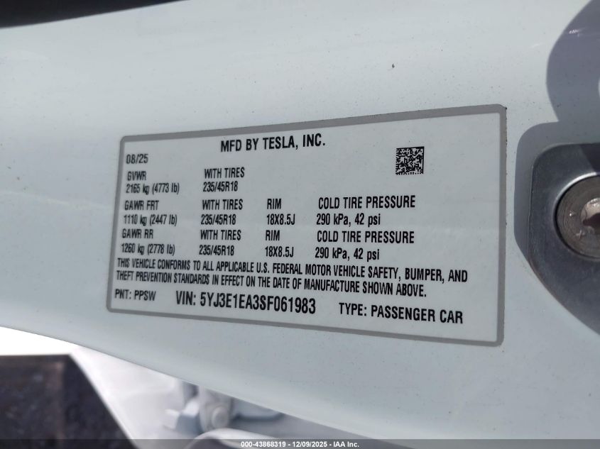 2025 TESLA MODEL 3 2025 року Електричний, U, Задній привід, vin - 5YJ3E1EA3SF061983 з США