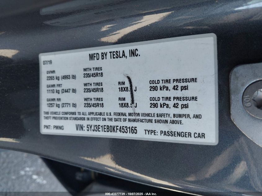 2019 TESLA MODEL 3 2019 року Електричний, U, Повний привід, vin - 5YJ3E1EB0KF453165 з США