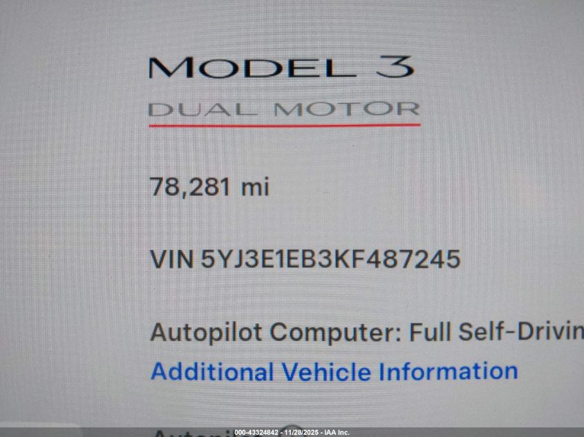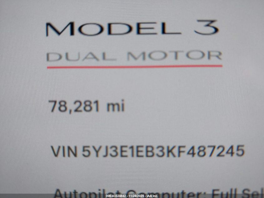 2019 TESLA MODEL 3 2019 року Електричний, U, Повний привід, vin - 5YJ3E1EB3KF487245 з США