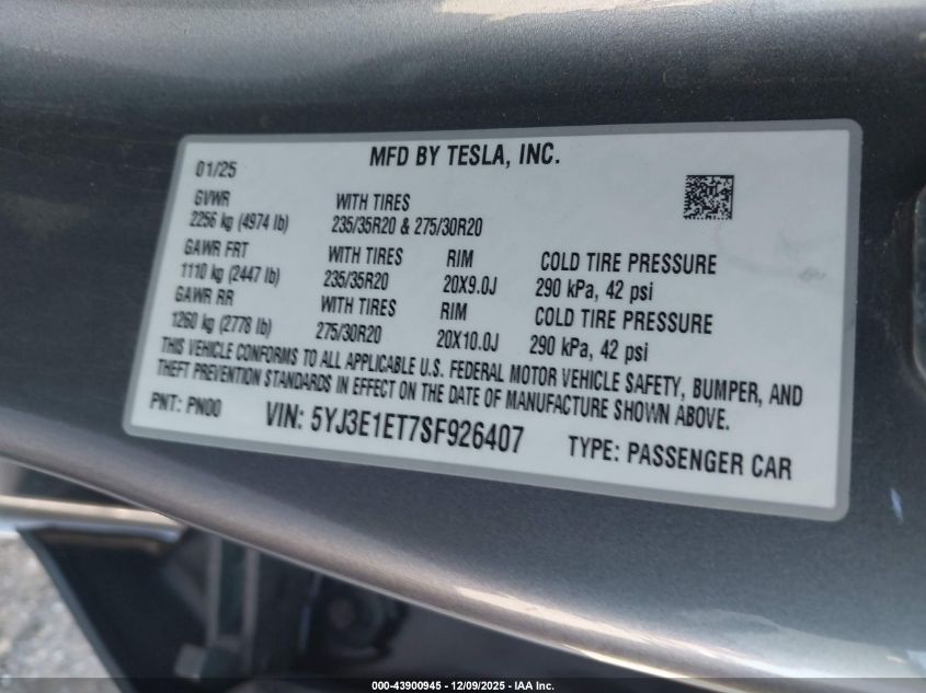 2025 TESLA MODEL 3 2025 року Електричний, U, Повний привід, vin - 5YJ3E1ET7SF926407 з США