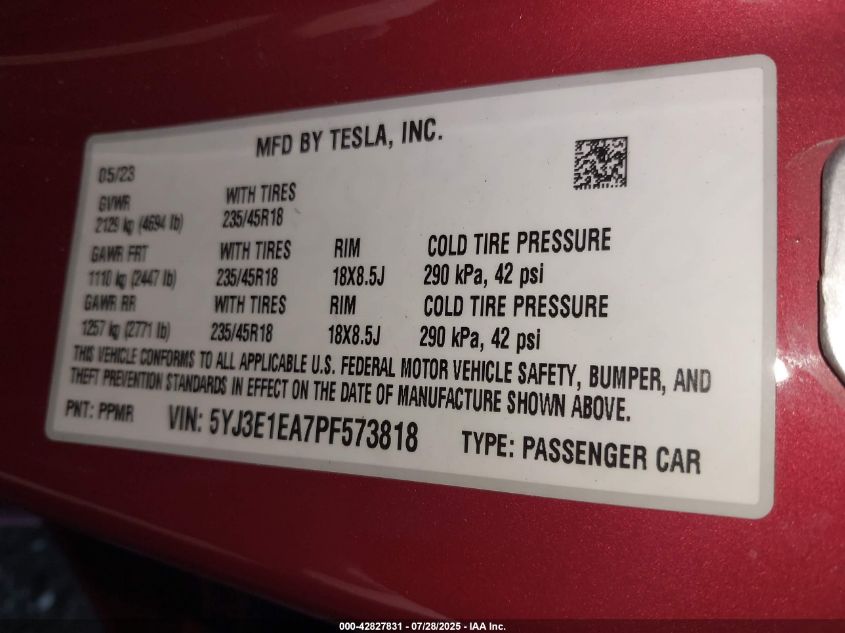 2023 TESLA MODEL 3 2023 року Електричний, U, Задній привід, vin - 5YJ3E1EA7PF573818 з США