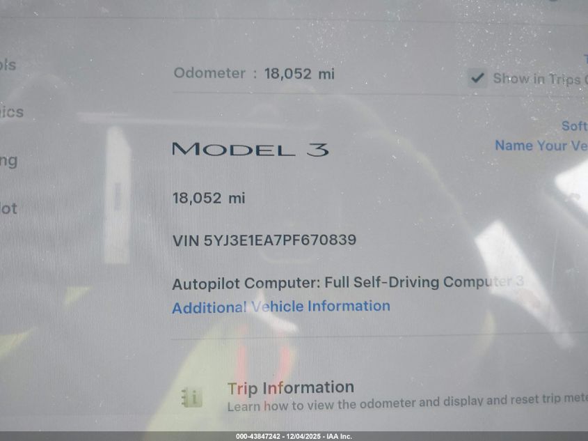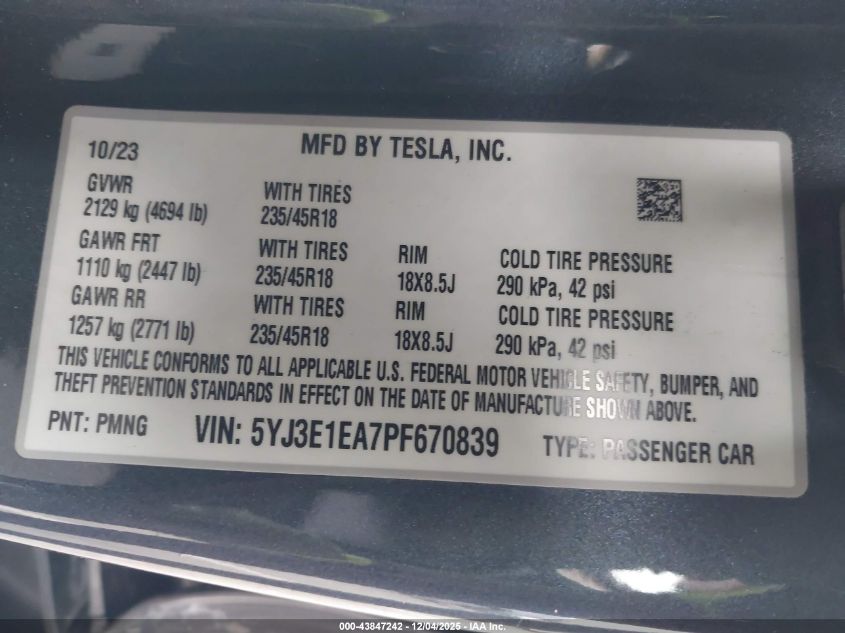 2023 TESLA MODEL 3 2023 року Електричний, U, Задній привід, vin - 5YJ3E1EA7PF670839 з США