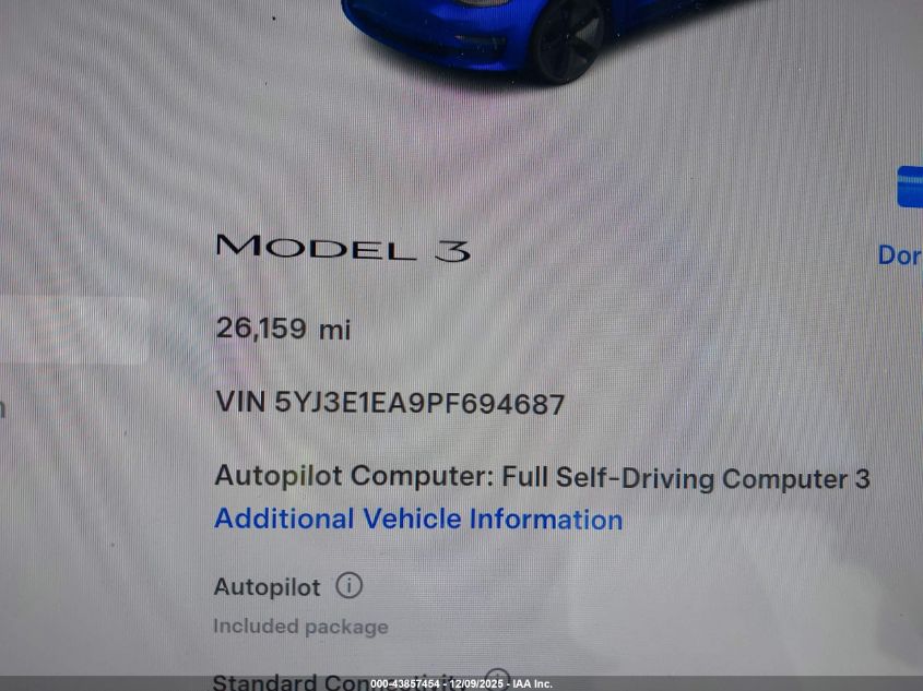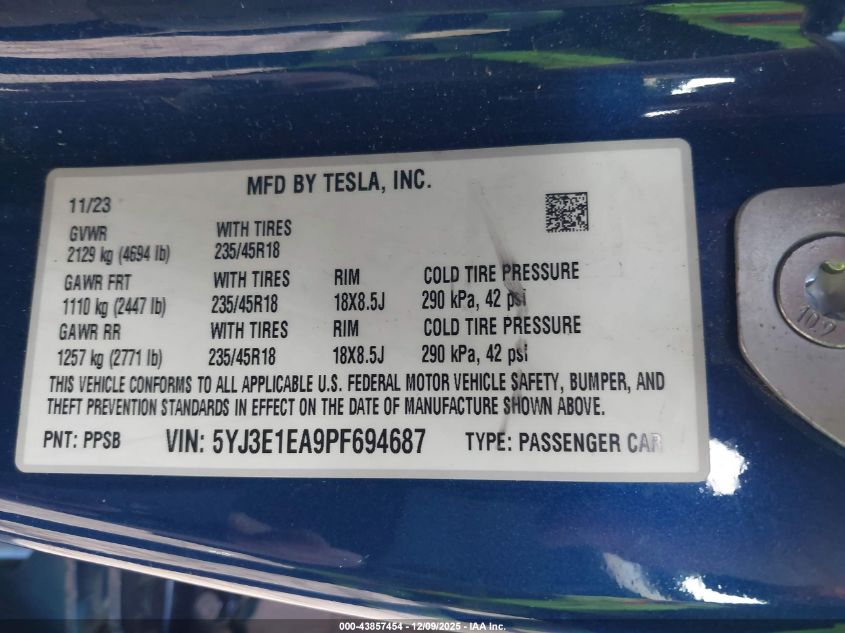 2023 TESLA MODEL 3 2023 року Електричний, U, Задній привід, vin - 5YJ3E1EA9PF694687 з США
