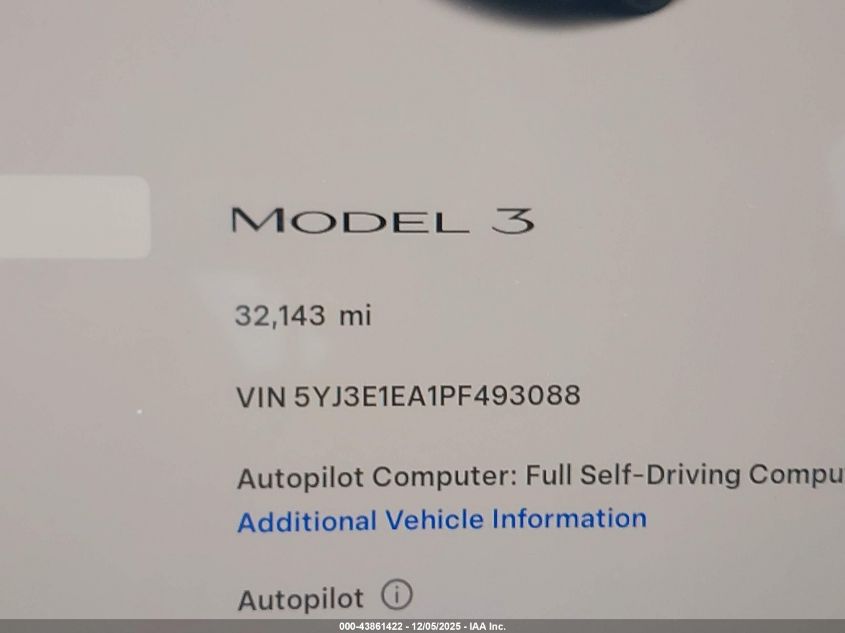 2023 TESLA MODEL 3 2023 року Електричний, U, Задній привід, vin - 5YJ3E1EA1PF493088 з США