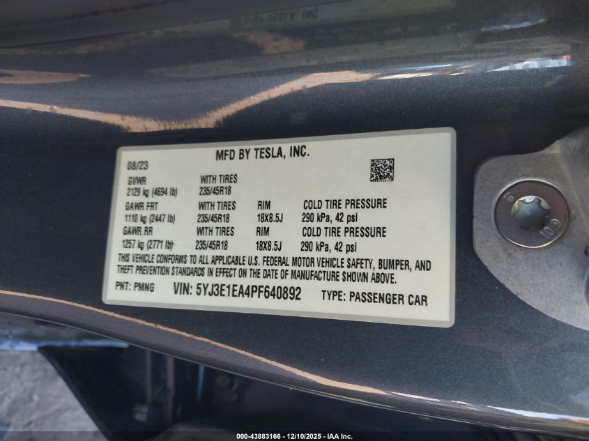 2023 TESLA MODEL 3 2023 року Електричний, U, Задній привід, vin - 5YJ3E1EA4PF640892 з США