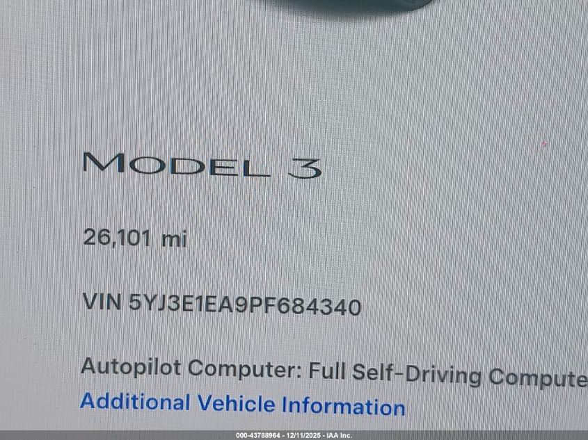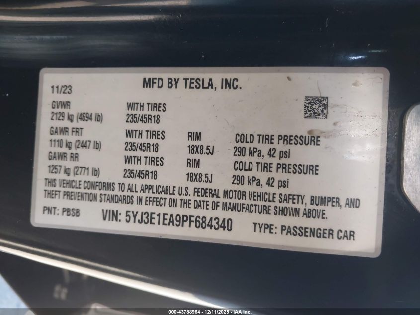 2023 TESLA MODEL 3 2023 року Електричний, U, Задній привід, vin - 5YJ3E1EA9PF684340 з США