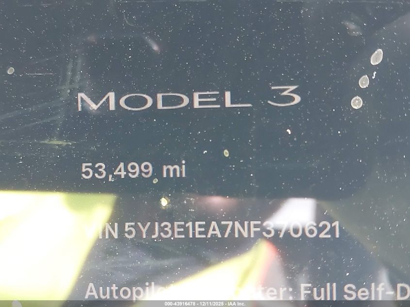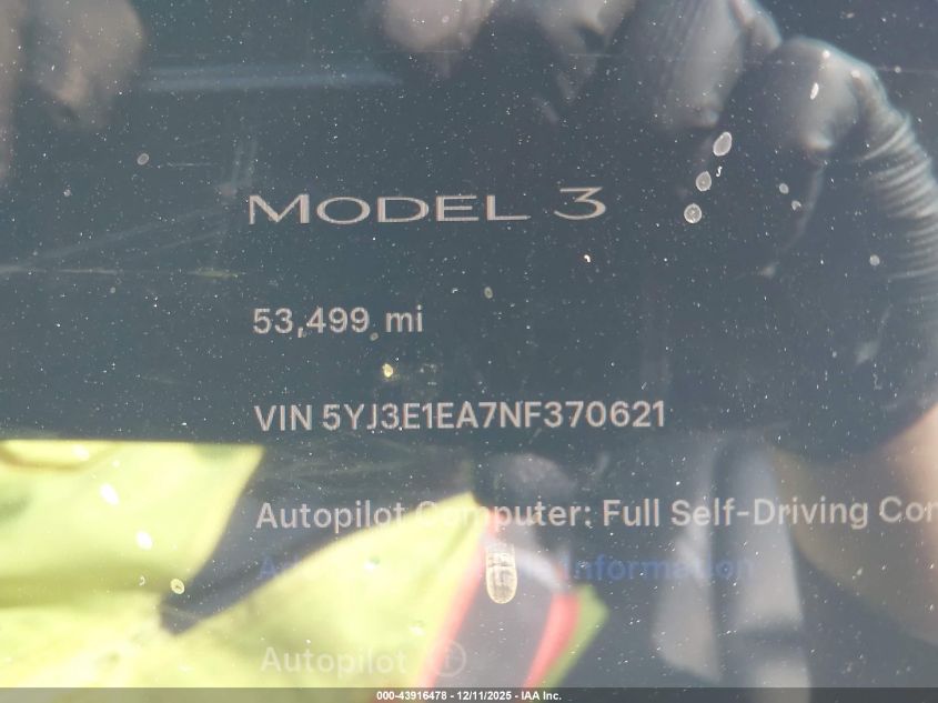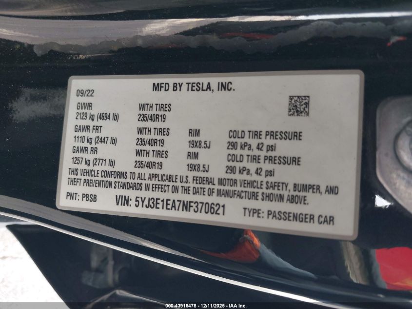 2022 TESLA MODEL 3 2022 року Електричний, U, Задній привід, vin - 5YJ3E1EA7NF370621 з США