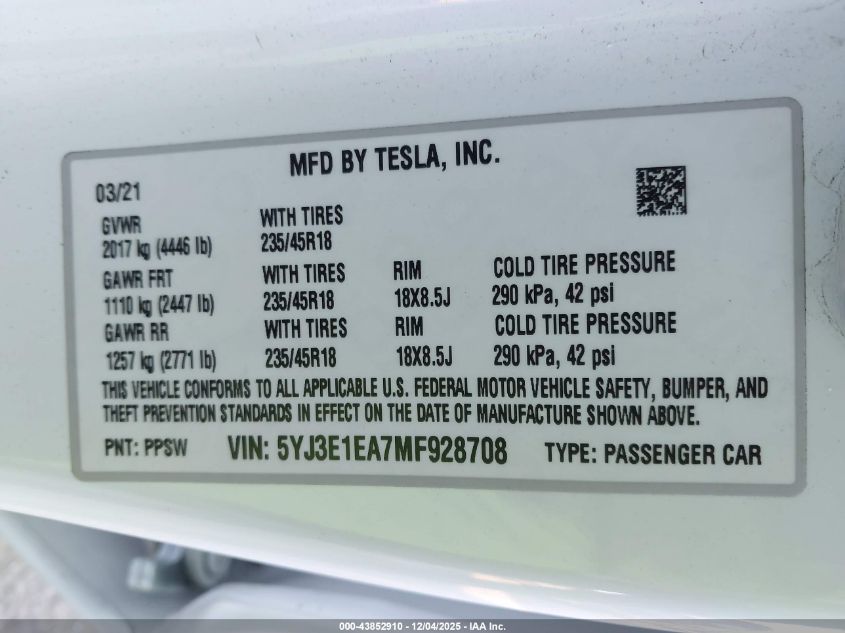 2021 TESLA MODEL 3 2021 року Електричний, U, Задній привід, vin - 5YJ3E1EA7MF928708 з США