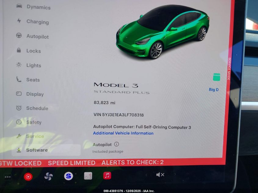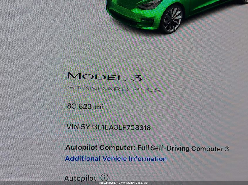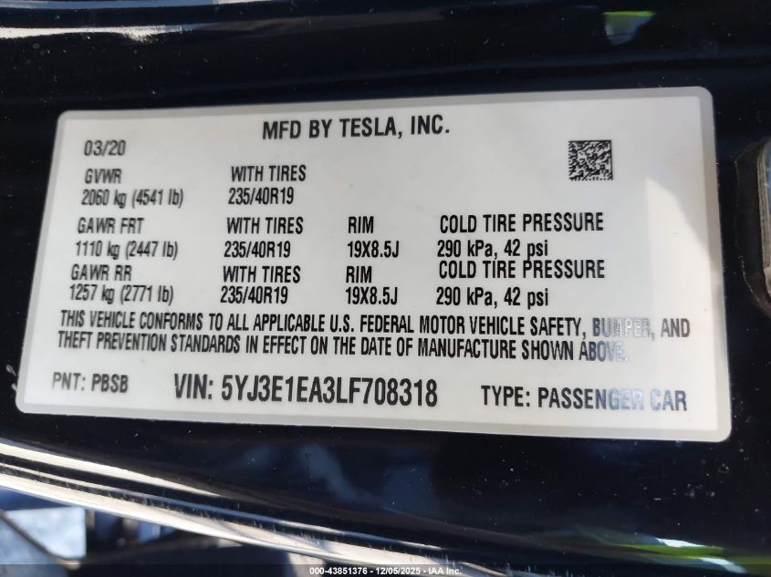 2020 TESLA MODEL 3 2020 року Електричний, U, Задній привід, vin - 5YJ3E1EA3LF708318 з США
