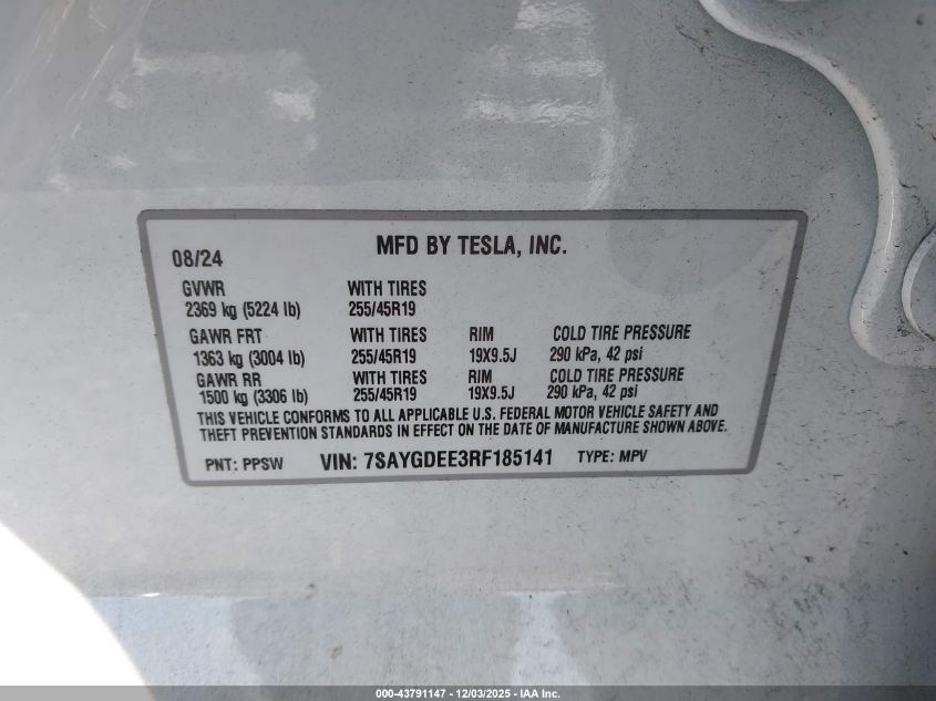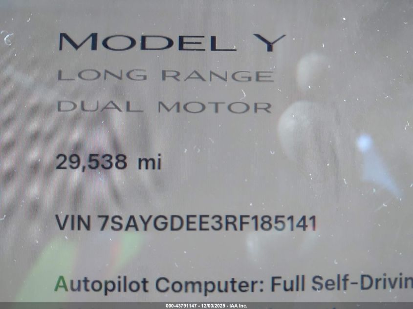 2024 TESLA MODEL Y 2024 року Електричний, U, Повний привід, vin - 7SAYGDEE3RF185141 з США