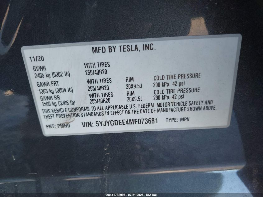 2021 TESLA MODEL Y 2021 року Електричний, U, Повний привід, vin - 5YJYGDEE4MF073681 з США