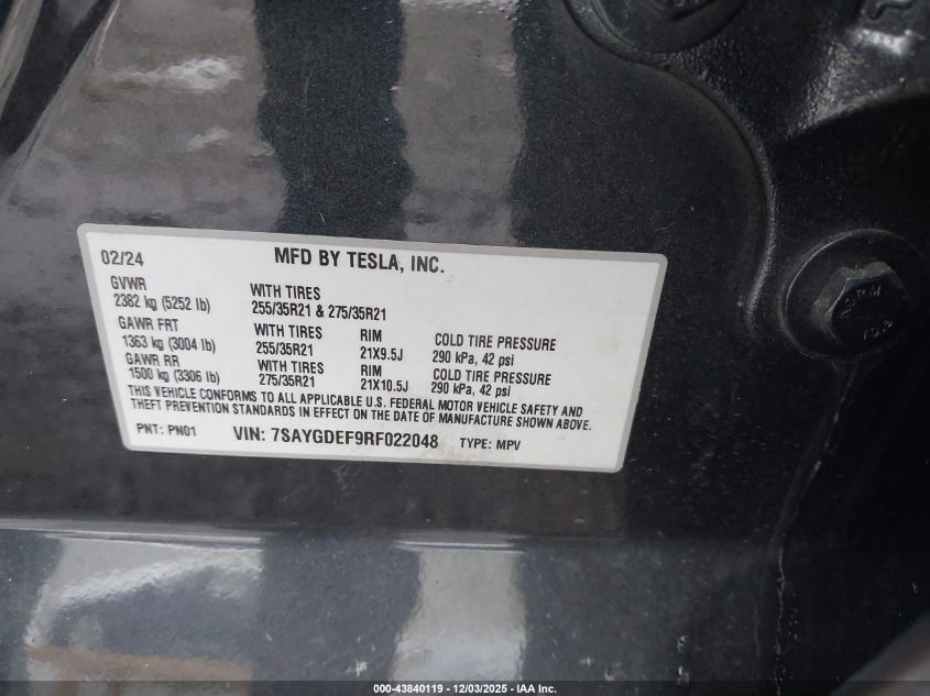 2024 TESLA MODEL Y 2024 року Електричний, U, Повний привід, vin - 7SAYGDEF9RF022048 з США