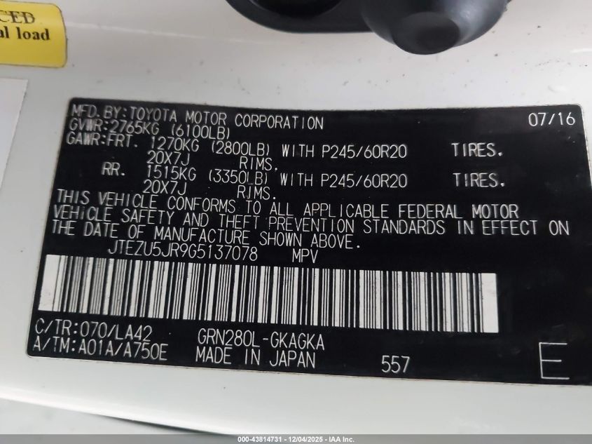 2016 TOYOTA 4RUNNER 2016 року Бензин, 4.0, , vin - JTEZU5JR9G5137078 з США
