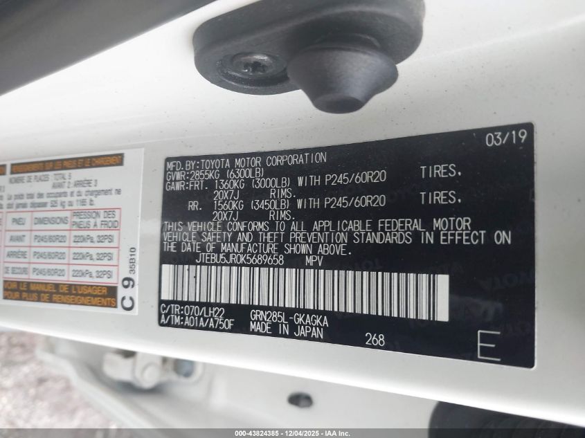 Колір БілийЦиліндри 6Привід Повний привідVIN JTEBU5JR0K5689658Стан Заводиться та їде (перевірено)Ушкодження Задня AutoRIA