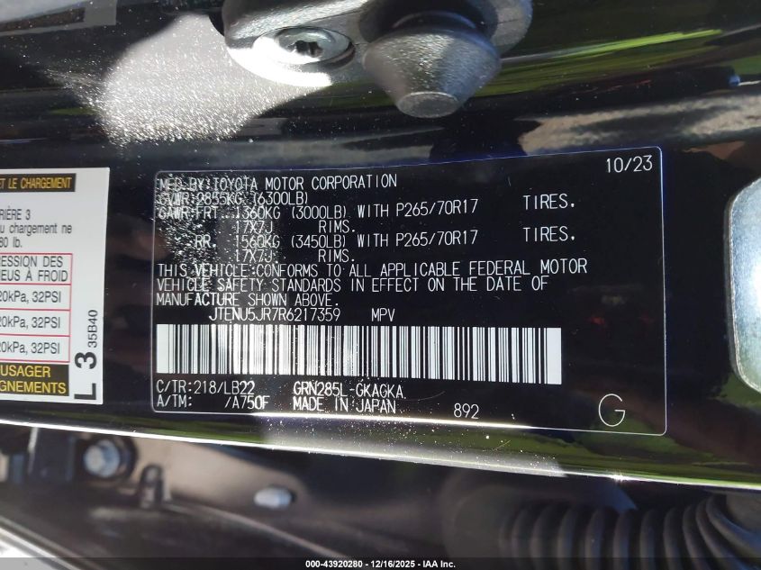 2024 TOYOTA 4RUNNER 2024 року Бензин, 4.0, Повний привід, vin - JTENU5JR7R6217359 з США