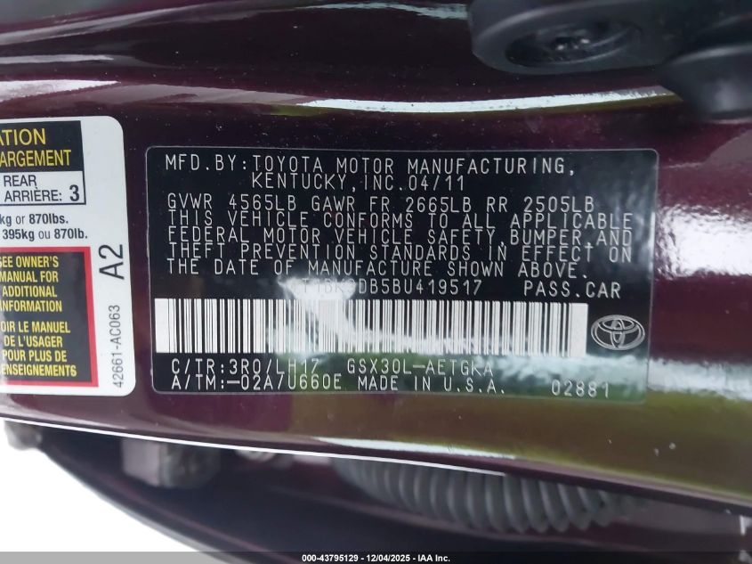 2011 TOYOTA AVALON 2011 року Бензин, 3.5, Передній привід, vin - 4T1BK3DB5B4419517 з США