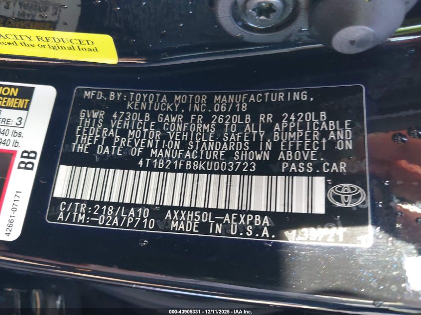 Колір ЧорнийЦиліндри 4Привід Передній привідVIN 4T1B21FB8KU003723Стан Заводиться та їде (перевірено)Ушкодження Передня або задня AutoRIA