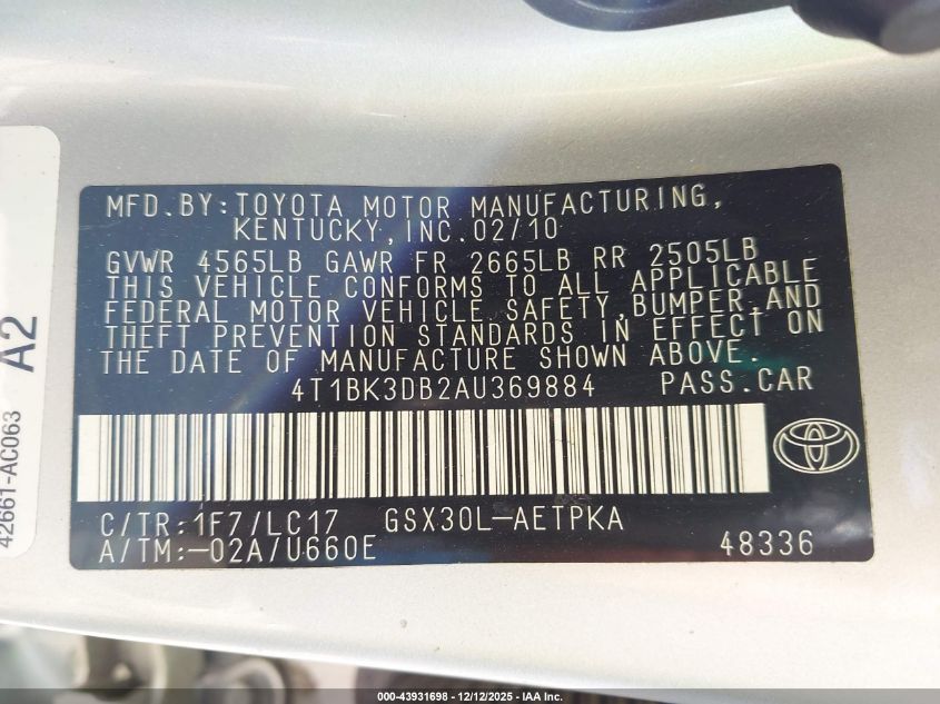 Колір СрібнийЦиліндри 6Привід Передній привідVIN 4T1BK3DB2AU369884Стан Заводиться та їде (перевірено)Ушкодження Передня або задня AutoRIA