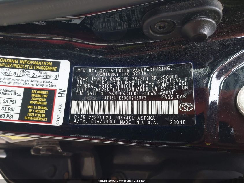 Колір ЧорнийЦиліндри 6Привід Передній привідVIN 4T1BK1EB0GU215072Стан Заводиться та їде (перевірено)Ушкодження Задня ліва AutoRIA