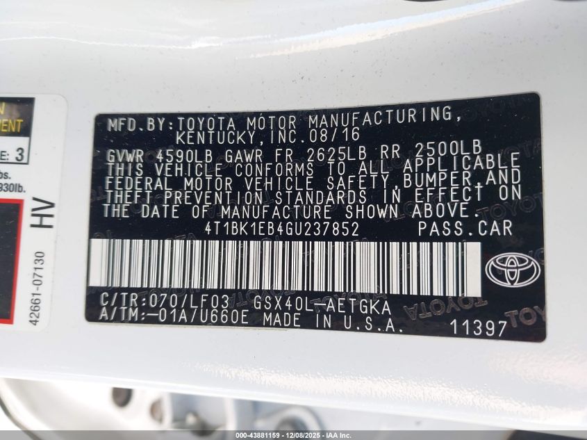 2016 TOYOTA AVALON 2016 року Бензин, 3.5, Передній привід, vin - 4T1BK1EB4GU237852 з США