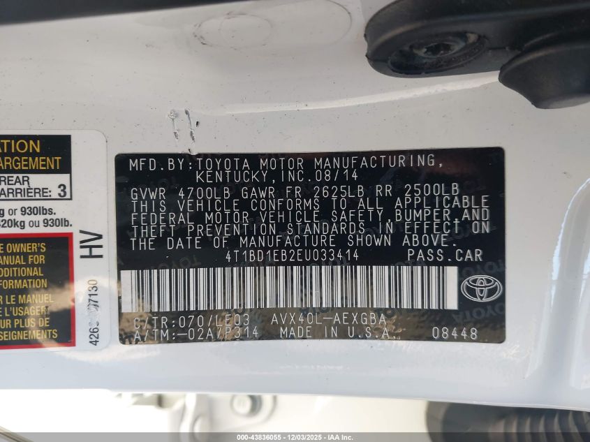 2014 TOYOTA AVALON 2014 року Гібрид, 2.5, Передній привід, vin - 4T1BD1EB2EU033414 з США