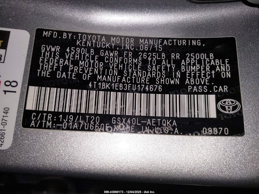 2015 TOYOTA AVALON 2015 року Бензин, 3.5, Передній привід, vin - 4T1BK1EB3FU174676 з США