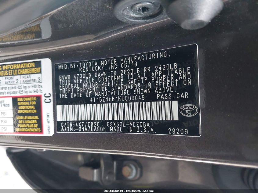 2019 TOYOTA AVALON 2019 року Бензин, 3.5, Передній привід, vin - 4T1BZ1FB1KU009049 з США