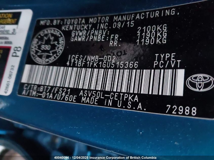 2016 TOYOTA CAMRY 2016 року Бензин, , Передній привід, vin - 4T1BF1FK1GU515366 з США