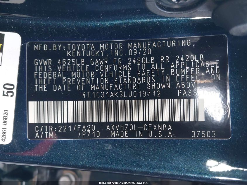 2020 TOYOTA CAMRY HYBRID 2020 року Гібрид, 2.5, Передній привід, vin - 4T1C31AK3LU019712 з США