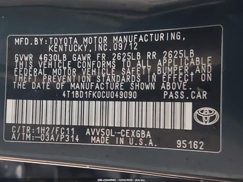 2012 TOYOTA CAMRY HYBRID 2012 року Гібрид, 2.5, Передній привід, vin - 4T1BD1FK0CU049090 з США