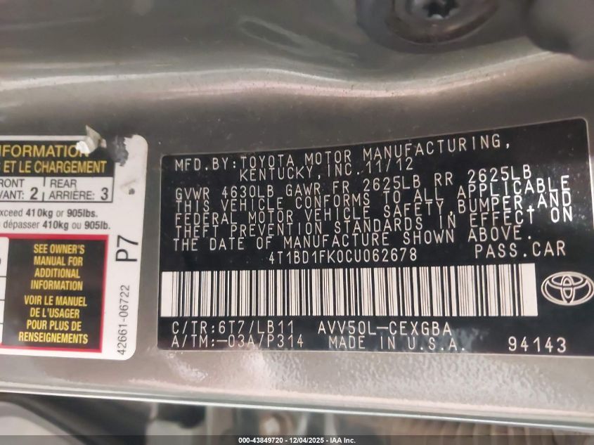 2012 TOYOTA CAMRY HYBRID 2012 року Гібрид, 2.5, Передній привід, vin - 4T1BD1FK0CU062678 з США