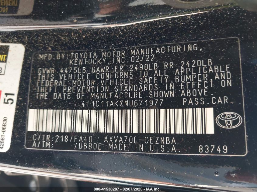 2022 TOYOTA CAMRY 2022 року Бензин, 2.5, Передній привід, vin - 4T1C11AKXNU671977 з США