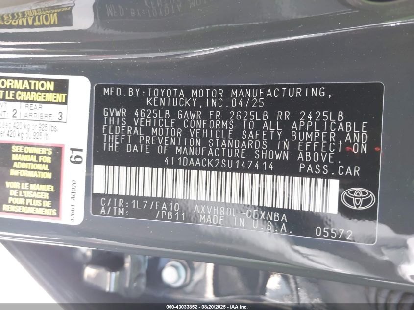 2025 TOYOTA CAMRY 2025 року Гібрид, 2.5, Передній привід, vin - 4T1DAACK2SU147414 з США
