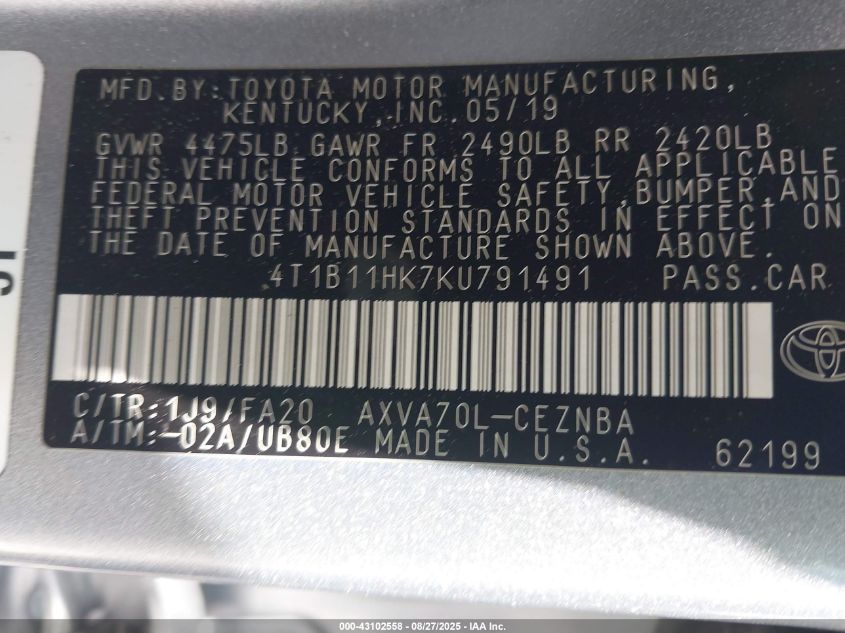 2019 TOYOTA CAMRY 2019 року Бензин, 2.5, Передній привід, vin - 4T1B11HK7KU791491 з США