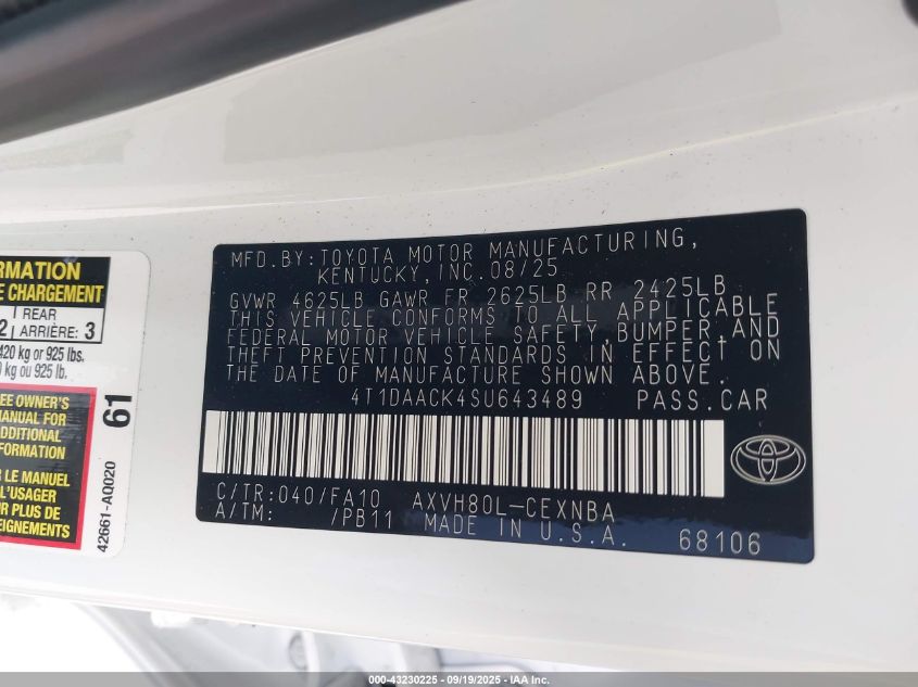2025 TOYOTA CAMRY 2025 року Гібрид, 2.5, Передній привід, vin - 4T1DAACK4SU643489 з США