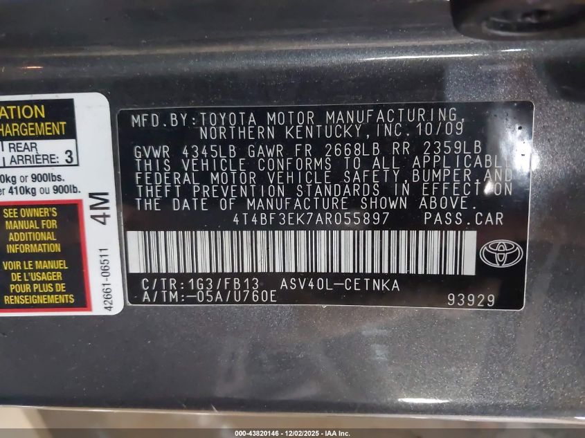 2010 TOYOTA CAMRY 2010 року Бензин, 2.5, Передній привід, vin - 4T4BF3EK7AR055897 з США
