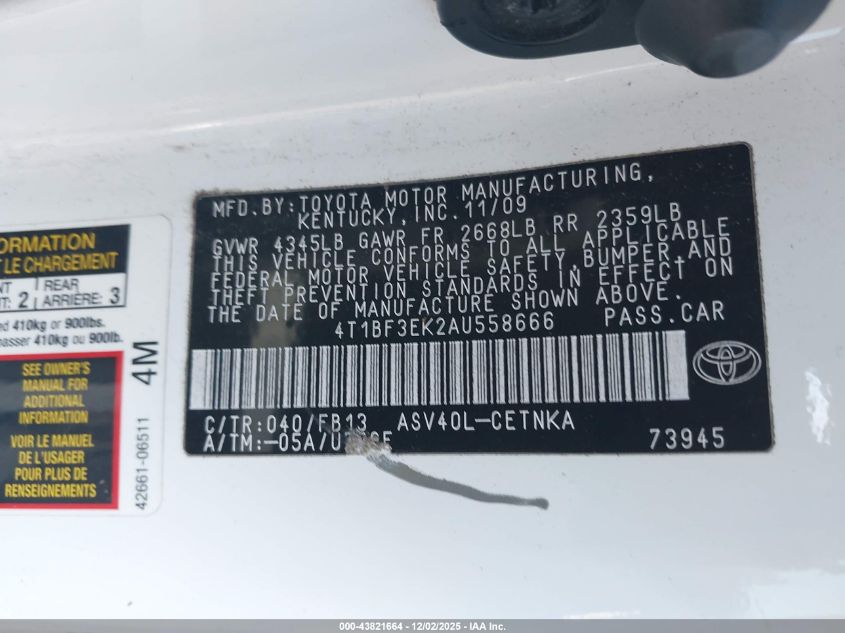 2010 TOYOTA CAMRY 2010 року Бензин, 2.5, Передній привід, vin - 4T1BF3EK2AU558666 з США