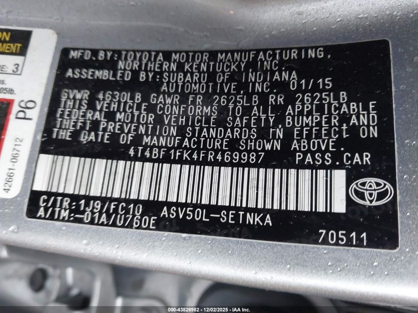 2015 TOYOTA CAMRY 2015 року Бензин, 2.5, Передній привід, vin - 4T4BF1FK4FR469987 з США