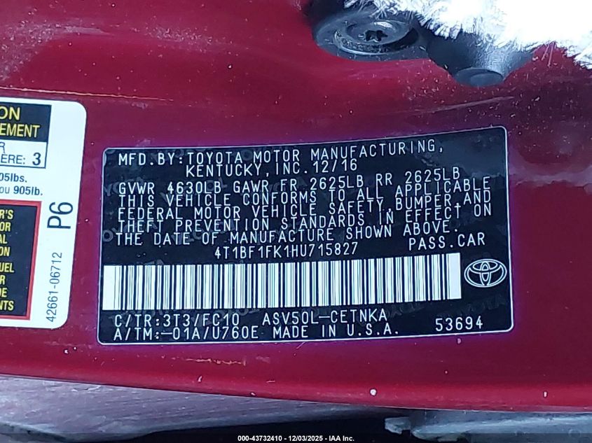 2017 TOYOTA CAMRY 2017 року Бензин, 2.5, Передній привід, vin - 4T1BF1FK1HU715827 з США