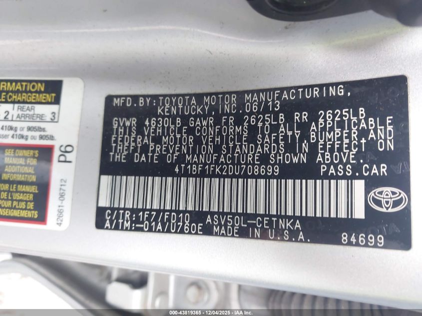 2013 TOYOTA CAMRY 2013 року Бензин, 2.5, Передній привід, vin - 4T1BF1FK2DU708699 з США