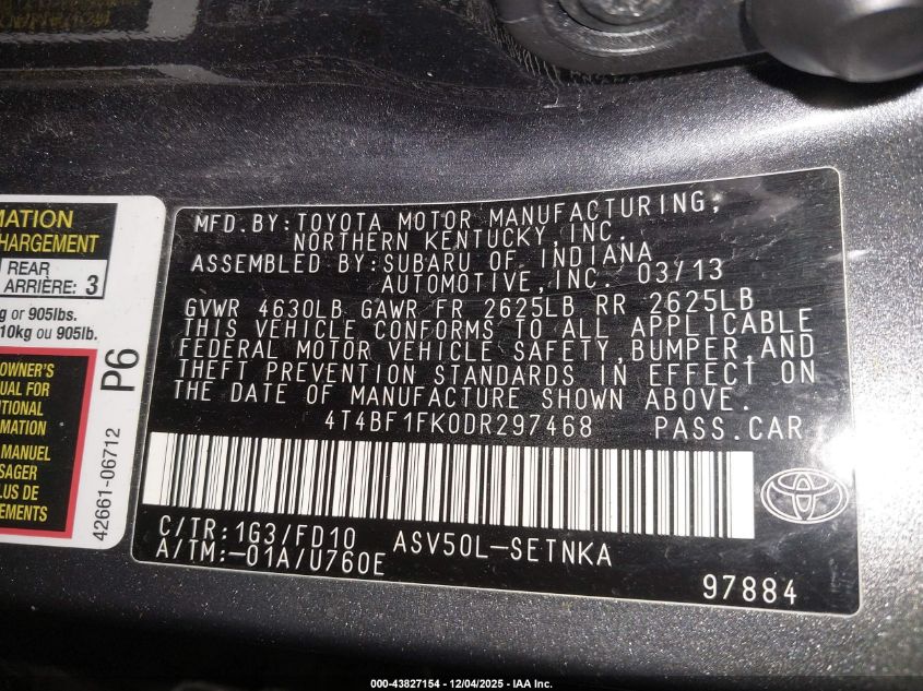 Колір СірийЦиліндри 4Привід Передній привідVIN 4T4BF1FK0DR297468Стан Заводиться та їде (перевірено)Ушкодження Права сторона AutoRIA