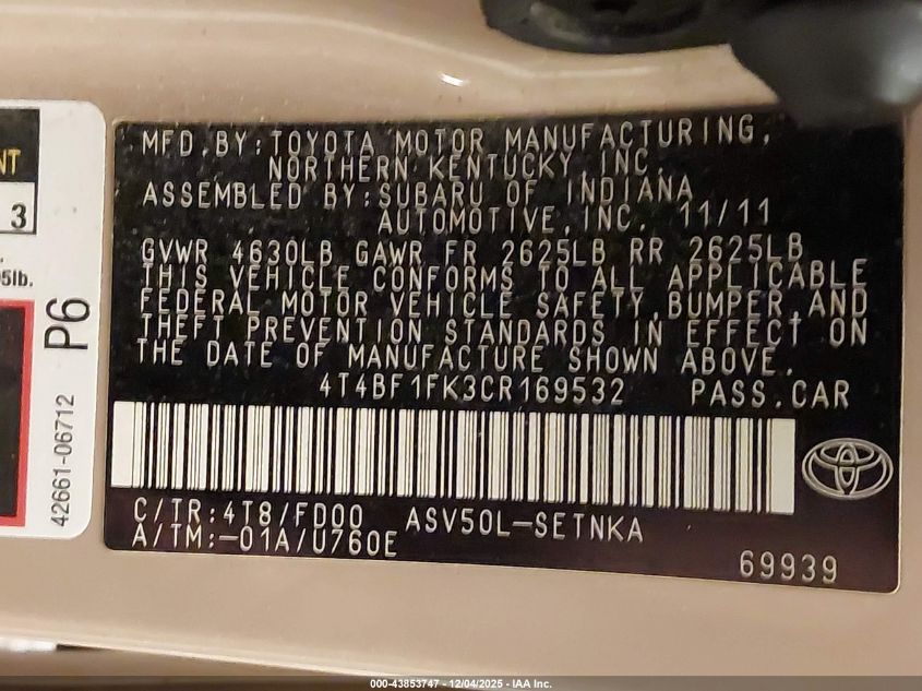Колір ЗолотийЦиліндри 4Привід Передній привідVIN 4T4BF1FK3CR169532Стан Заводиться та їде (перевірено)Ушкодження Передня або задня AutoRIA