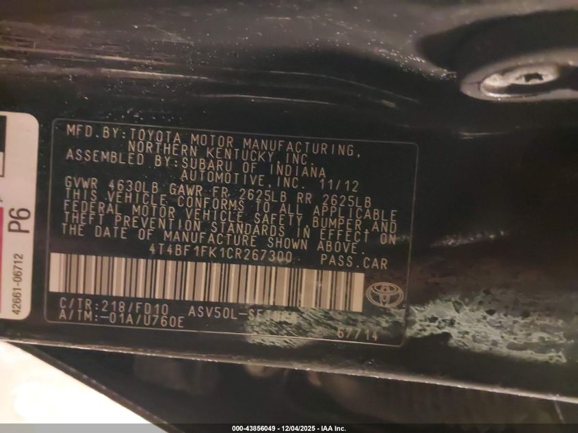 2012 TOYOTA CAMRY 2012 року Бензин, 2.5, Передній привід, vin - 4T4BF1FK1CR267300 з США