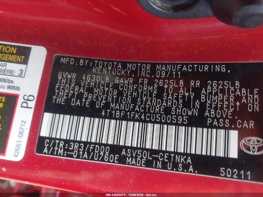 Колір ЧервонийЦиліндри 4Привід Передній привідVIN 4T1BF1FK4CU500595Стан Заводиться та їде (перевірено)Ушкодження Передня або задня AutoRIA